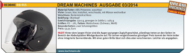 Tragekomfort und Preis überzeugen die Redaktion der Fachzeitschrift „Dream Machines“ und empfiehlt den Redbike Helm RB-915 aus dem Hause Kochmann als „Preis-Tipp“.
